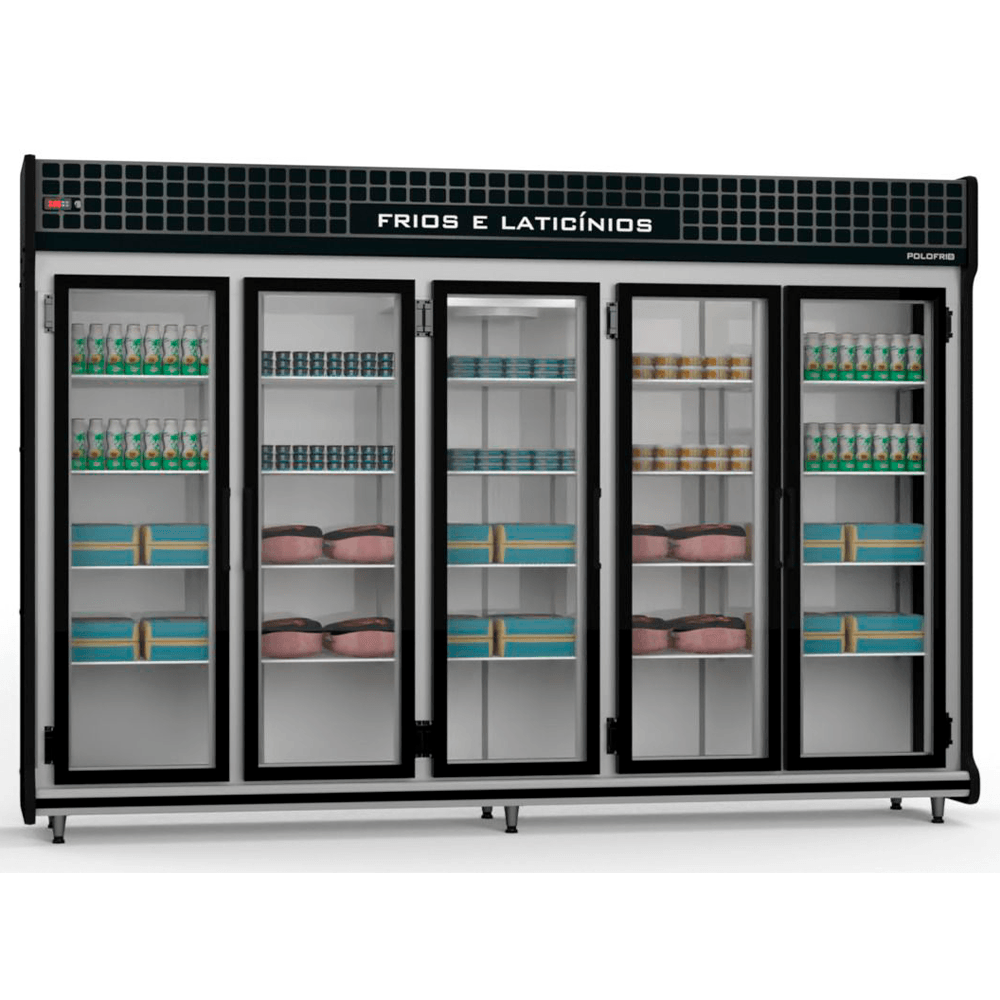 Este equipamento da marca POLOFRIO, código 2157, é um expositor vertical refrigerado de 5 portas, projetado para a conservação e exposição de diversos tipos de produtos em estabelecimentos comerciais.